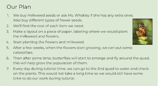 - Present their plans to their classmates. Students who want to put their plan to work are supported to present their plans to stakeholders.