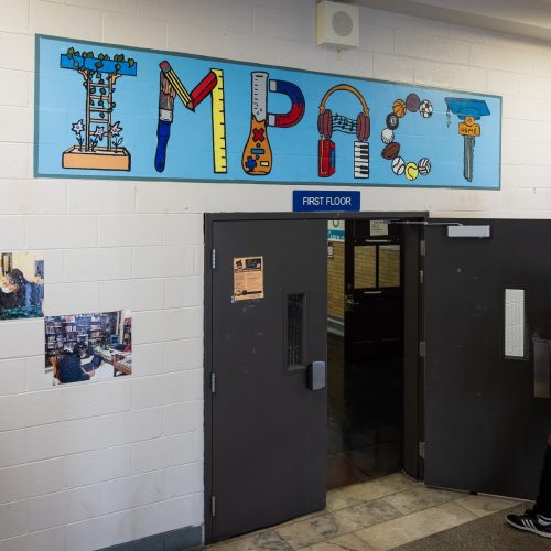 Brainstorming one day, a student created a ladder as one of the letters to IMPACT. That spark led to everyone designing letters that would become the design. It wasn’t until we finished the mural when we realized there was a metaphor to the letters in order. School is like planting seeds of growth (I), using the tools (M), to learn math and sciences (P), listening to the music in our hearts (A), playing physically and mentally (C), so we can graduate and find home (T).