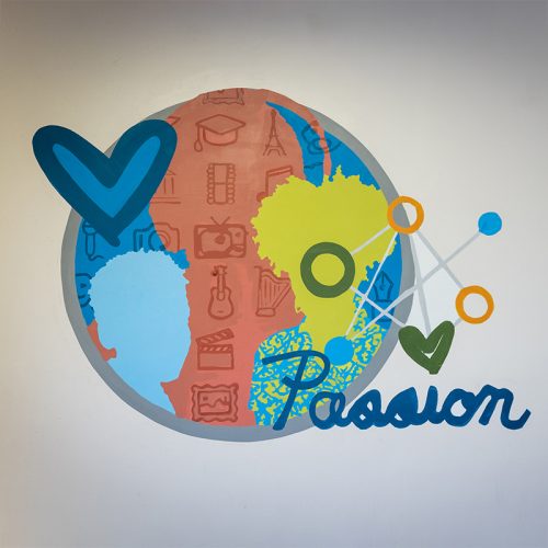 The Passion mural was completed in November of 2021 along with the Agency mural by a class of 18 students guided by Guest Teacher Brad Carney, a professional artist and Mural Arts Philadelphia staff member. They are the first two in a series of murals exploring the school’s motto and core principles.