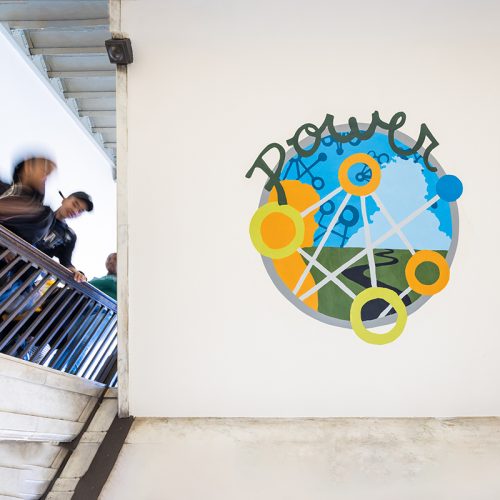 The Power mural is the third completed in a series exploring the school’s motto: Power. Passion. Agency. The spring semester class completed the mural in June 2022. It was installed near the other two murals in this series in the naturally-lit marble stairway above the school’s main entrance.