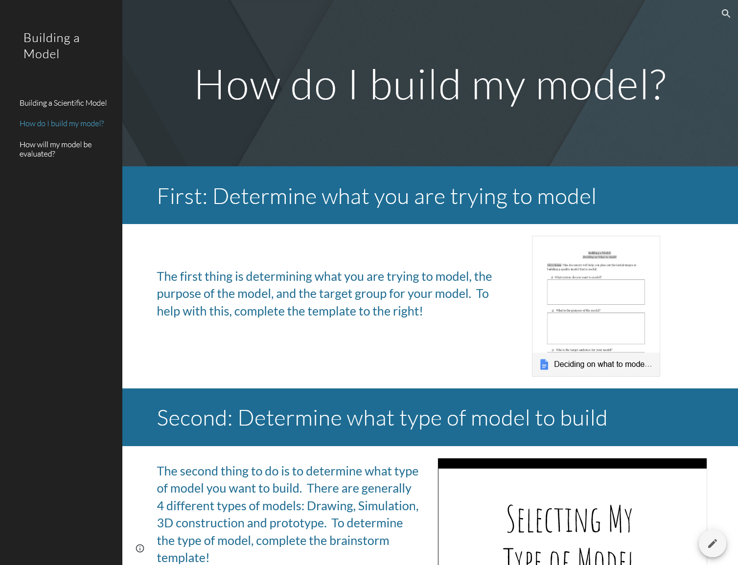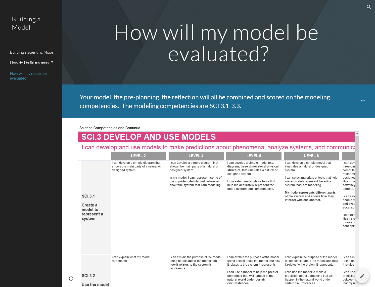 Student Guide: Building a Scientific Model Jim Novak | Performance Task Guide | Develop and Use Models | Google Site A model can be a physical representation—such as a drawing, 3D construction, simulation, or prototype—of an object, phenomenon, system, pattern, or process. Log in Image Carousel View more resources in Competency Add to favorites Analyze and Interpret Data Studio Guide Studio Guide: The Spread of a Pathogen Add to favorites Develop and Use Models Performance Task Guide Student Guide: Building a Scientific Model View more resources in Author Add to favorites Analyze and Interpret Data Studio Guide Studio Guide: It’s Alive! Well…maybe Add to favorites Analyze and Interpret Data Studio Guide Studio Guide: The Spread of a Pathogen Add to favorites Getting Started Google Sites Tutorial Add to favorites Technical Writing Performance Task Guide Student Guide: Science Technical Writing