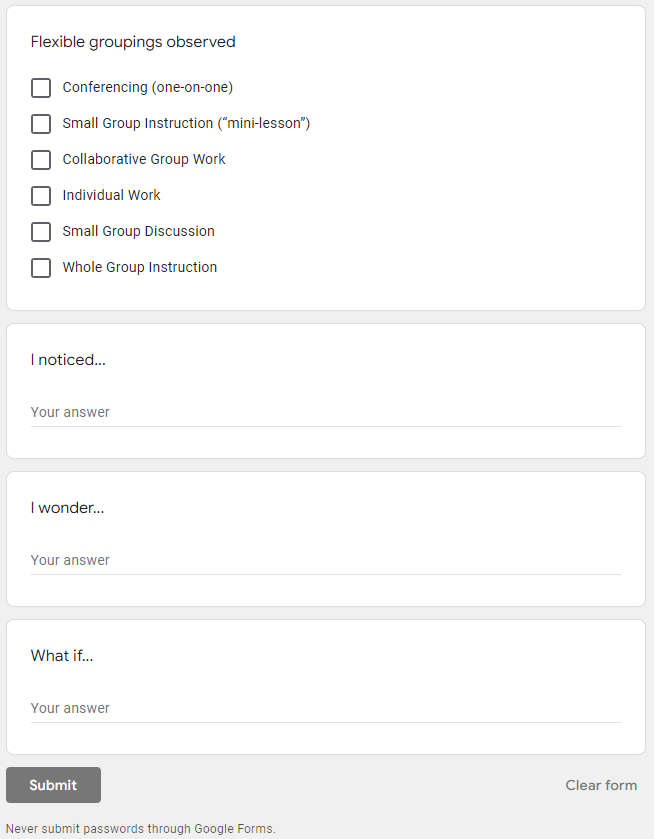 This form is meant to provide consistent feedback to teachers and to be separate from a formal teacher evaluation process. Any school leader or teacher can use this tool to provide feedback to any teacher.
